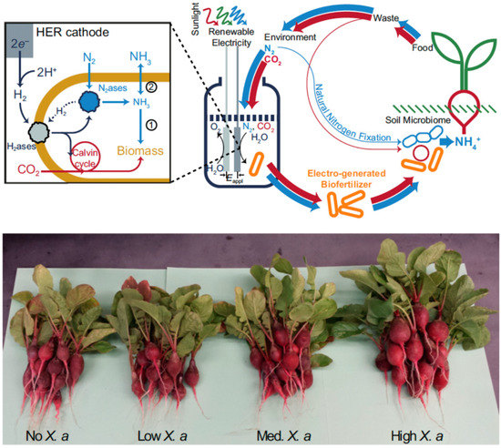 Liu et al. demonstrated the use of H2 generated from catalytic water splitting driven by renewable energy to support diazotrophic growth of autotroph Xanthobacter autotrophicus. In that way the production of X. autotrophicus as biofertilizer or NH3 (when glutamine synthetase was inhibited) is efficiently connected to atmospheric nitrogen. The biomass produced was applied to radishes and significantly increased the yield of radish storage roots (Figure 4) [144]. Their system achieved a nitrogen reduction turnover numbers of ∼9 × 109 bacterial cell−1 and 2 × 106 nitrogenase−1 and a turnover frequency of 1.9 × 104 s−1 per bacterial cell, or ∼4 s−1·nitrogenase−1.