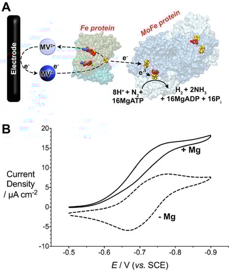 (A) Bioelectrocatalytic dinitrogen (N2) fixation by Mo-dependent nitrogenase using methyl viologen (MV) as an electron mediator. (B) Cyclic voltammetric data (scan rate = 0.002 V s−1) for bioelectrocatalytic N2 fixation. The electrochemical cell contained MOPS buffer (100 mM, pH 7), a MgATP-regenerating mixture (ATP, creatine phosphate, creatine phosphokinase), 0.1 mg mL−1 of MoFe protein, and 20× equivalents of the Fe protein. The addition of Mg2+ permits MgATP hydrolysis by the Fe protein and initiates bioelectrocatalytic N2 fixation. Reprinted (adapted) with permission from [150]. Copyright 2019 American Chemical Society.