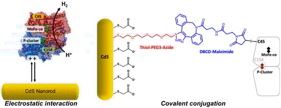 Harris et al. investigated the attachment of the MoFe protein to CdS nanorod surfaces: (left) surface-capping groups with different charges were employed, and (right) solvent-exposed Cys residues of the MoFe protein were used to covalently conjugate the MoFe protein to CdS nanorod surfaces. Reprinted (adapted) with permission from [168]. Copyright 2020 American Chemical Society.