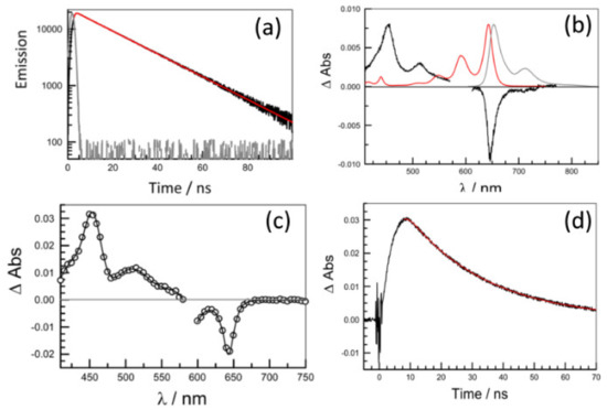 (a) Fluorescence decay curve recorded by time-correlated, single photon counting methods following excitation at 635 nm. The experimental data appear as a solid black line with the non-linear least-squares best fit superimposed as a red line. The instrument response function is shown in grey. (b) Example of a transient differential absorption spectrum recorded 5 ps after excitation of TIPS-P in toluene at 590 nm (FWHM = 0.2 ps) (black curve), together with the ground-state absorption spectrum (red curve) and the S1-S0 fluorescence spectrum (grey curve). (c) Example of a S1-SN transient differential absorption spectrum recorded for TIPS-P in de-aerated toluene following excitation with a 4-ns laser pulse at 585 nm. The spectrum was recorded after a delay time of 10 ns. (d) Example of a kinetic decay curve recorded at 455 nm following 4-ns laser excitation of TIPS-P in de-aerated toluene at room temperature.