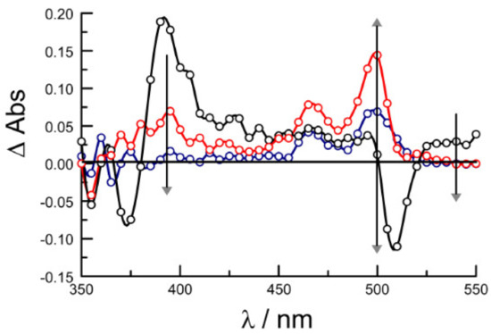 Transient absorption spectra for redaporfin in the presence of TIPS-P in de-aerated toluene with laser excitation at 355 nm. Individual spectra were recorded at delay times of 2.4 μs (black), 15.2 μs (red) and 50.4 μs (blue). The downwards arrows indicate wavelengths at which the redaporfin triplet can be monitored. The arrow at 500 nm indicates growth and subsequent decay of TIPS-P triplet.