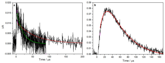 Transient differential absorption kinetic decays recorded for redaporfin in de-aerated toluene at room temperature. (a) Decay recorded at 530 nm in the absence of TIPS-P (red curve), where the lifetime is 55 μs, and in the presence of TIPS-P at a concentration of 63 μM (green curve). In the latter case the triplet lifetime of redaporfin is reduced to 18 μs. (b) Kinetic trace recorded at 500 nm, where the triplet state of TIPS-P dominates the spectral records. With [TIPS-P] = 63 μM, the measured rise-time constant is 17 μs and the subsequent decay time constant is 46 μs.