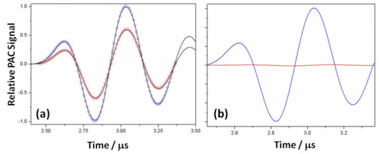 Shown in Figure 7a are solvent corrected and normalized photoacoustic waves obtained for azulene as photoacoustic reference [48] and for the mixture of redaporfin and TIPS-P. The experimental data were fitted according to two consecutive decays with the associated four parameters (ϕ1, τ1, ϕ2, τ2) allowed to float freely. The best fit yielded an initial decay with τ1 < 10 ns (i.e., faster than the time resolution of the 2.25 MHz detector) and a slower component with τ2 ≈ 100 ns. This longer lifetime is consistent with the TIPS-P concentration employed and with a bimolecular quenching rate constant of ca. 109 M–1 s–1. The open square and circle symbols relevant to Figure 7a represent the calculated waves obtained by fitting of the experimental photoacoustic wave. A simulation of the photoacoustic wave is presented as Figure 7b. The average values derived for ϕ1, ϕ2 and τ2, as well as the parameters used to calculate the triplet energy (ET) of TIPS-P, are collected in Table 1. The final value for ET of TIPS-P calculated with Equation (1) is 7940 ± 1200 cm−1, while the lifetime of the quenched triplet of redaporfin is ca. 110 ns for both TIPS-P concentrations employed here.