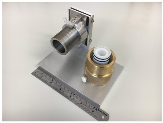 Photograph of the variable path length optical cell used to record the effect of solute concentration on the absorption and fluorescence spectral properties of TIPS-P in toluene. A screw barrel allows easy variation of the path length while the double seal prevents leakage of solution. The set-up fits comfortably into a range of spectrophotometers. Calibration of the path length is made by reference to standard solutions and/or birefringence effects.