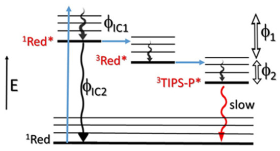 Illustration of the various energy loss steps associated with excitation and decay processes following excitation of redaporfin in the presence of TIPS-P. NB φIC1 has a value of unity while φIC2 for redaporfin is 0.212. The quantum yield for intersystem crossing in the redaporfin molecule is 0.65. Recall radiationless decay from the TIPS-P triplet state, shown as a red arrow, is too slow to be monitored by our PAC set-up.