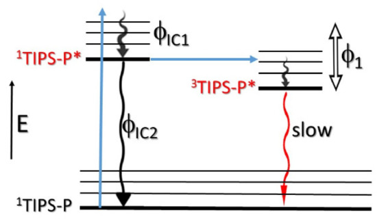 The derived ET for TIPS-P can be used [35,36,46] to estimate the quantum yield for nonradiative deactivation of the excited-singlet state. It will be recalled that our estimate for the fluorescence quantum yield in degassed toluene and air-equilibrated solution (ΦF = 0.92 and 0.75, respectively) implies that radiationless decay will be small for TIPS-P at low concentration. Scheme 2 depicts the processes relevant to such conditions ([TIPS-P] <10 μM) when TIPS-P is excited directly at 643 nm (i.e., 15,560 cm-1). In air-equilibrated solution, the very fast formation of TIPS-P excited-singlet state leads to state depopulation by three distinct processes: fluorescence, intersystem crossing to the triplet manifold and internal conversion to reform the ground state. The nonradiative deactivation processes are detected as a prompt photoacoustic signal and Equations (2) and (3) can be used to describe the fraction of prompt heat (ϕ1) released [46]. The ground state recovered by fluorescence also relaxes in this time window and contributes to the photoacoustic signal (ΦF × ΔEr). On the assumption that ϕIC1 is unity and on extrapolation to zero laser power, the final conclusion is that ΦT under these conditions is less than a few percent (Table 2). This is fully consistent with our failure to detect significant triplet population on direct excitation of TIPS-P.