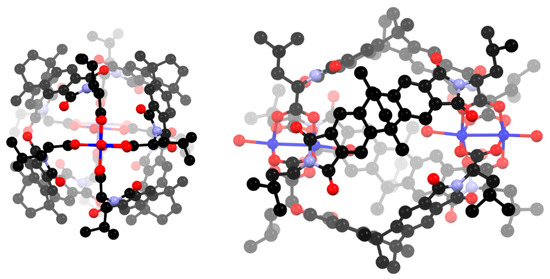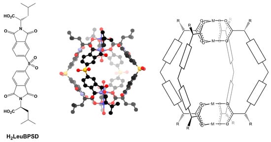 Recently we showed that it is possible to form charge-neutral, helical complexes of the form Cu4L4 containing two copper paddlewheel motifs and four dicarboxylate ligands containing amino acids, as shown in Figure 1 [35]. A similar, smaller cage complex was reported around the same time by Chen et al. [36], and many achiral analogues are known [37,38,39,40,41,42]. Subsequently we have explored how changing the nature of the dicarboxylate affects the type and size of cage that can be obtained. Using a more rigid naphthalenediimide-based ligand we, and others, isolated Cu12L12 octahedra [43,44] and, by using a more rotationally unrestricted biphenyl core, we obtained Cu8L8 “double-walled” squares [45]. It is also possible to isolate discrete catenanes using similar ligands [46], which are analogous to motifs observed in extended networks [47,48,49,50].