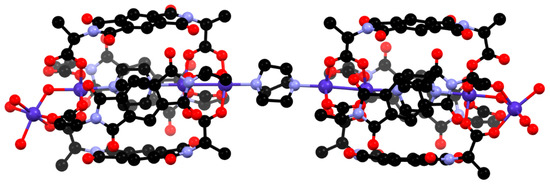 The reaction of H2L2 with cobalt nitrate at an elevated temperature in DMF yielded a few royal blue crystals (compound 2) that were suitable to obtain moderate resolution single crystal X-ray diffraction data using synchrotron radiation. Unfortunately, the yields were so low as to prohibit bulk analysis other than by mass spectrometry of the reaction solution, as described below. The crystal structure was solved and refined in the orthorhombic space group P21212 and contains halves of two crystallographically unique complexes in the asymmetric unit. The nature of the complex is somewhat complicated to determine unambiguously due to crystallographic disorder, with several possible sites for (de)protonation. However, the gross formulation is clear as a “dumbbell-like” complex consisting of two pseudo-[Co(L2)4(DABCO)] units, bridged by a central DABCO ligand with an overall formulation of [{Co4(L2)4(DABCO)(H2O)x}2(DABCO)], as shown in Figure 3. The two crystallographically unique dumbbell complexes both contain an axis of rotation passing through the central DABCO ligand, meaning that the two ends are symmetry equivalent. The two complexes appear to be compositionally identical, although the crystallographic disorder is different and, for brevity, only the complex with the more minor disorder is discussed below—see Appendix A for further crystallographic discussion.