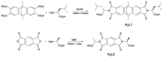 Two dicarboxylate ligands, containing amino acid residues, were synthesized as analogues of the sulfone–diphthalimide species that we previously used to form helical [Cu4(LeuBPSD)4] cages [35]. The two core groups used represent a longer, bent ligand using a 9, 10-dimethylethanoanthracene derivative (H2L1) and a shorter, more rigid ligand using a pyromellitic acid building block (H2L2). Pyromelliticdiimides are well known in the literature. For example, isophthalate derivatives have been used in MOFs with high sorption capacities [60], dipyridyl derivatives have been used in a number of coordination polymers [61,62,63,64], as have thioether derivatives [65], and the diimide core has also been incorporated into a number of macrocycles and receptors [66,67,68,69,70,71]. Pyromelliticdiimides based on amino acid derivatives have been reported in hydrogen-bonding systems and coordination polymers [72,73,74,75,76,77,78,79]. The applicability of the dihydroanthracene core group is hinted at in the literature with metallocages reported containing shorter ligands using bicyclooctene as a core group [36]; the ethanodihydroanthracene moiety can be viewed as an analogous, extended core group with the same geometry. This core group, as a bis-catechol, has been used in the synthesis of a uranyl lantern-type cage, discrete silane assemblies, and a Mn12 metallacycle [80,81,82].