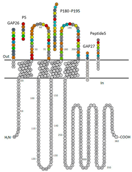 Plot of Cx43 protomer explaining sequence identity of peptide inhibitors GAP26, P5, GAP27, P180–195 and Peptide5. The membrane-embedded residues, including four transmembrane (TM) helices are recognized using the “positioning proteins in membrane” (PPM) server by the “orientation of proteins in membrane” (OPM) database [31]. AA colour code: aromatic—green; hydrophobic—gray; basic—blue; acidic—red; polar neutral—orange; Cys—lemon. Figure was generated by Protter [32].