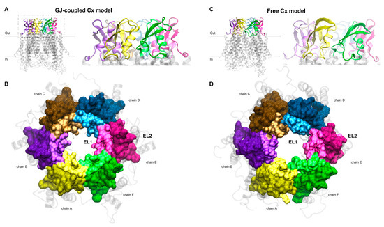 (A,B) Gap junction (GJ)-coupled homology model of Cx43HC with extracellular loops shown in cartoon representation in front view (A) and surf representation in top view (B). For the latter, the z-axis of the coordinate system was set up to point towards the channel. EL1 and EL2 loops of each chain, depicted using the “positioning proteins in membrane” (PPM) server by the “orientation of proteins in membrane” (OPM) database [31] as detailed in Section 2.2, are colored by lighter and darker versions of the same color, respectively. Color codes for the different chains are as follows: yellow (A), violet (B), brown (C), blue (D), magenta (E), green (F). TM helices and intracellular segments are shown in transparent light gray cartoon representation. (C,D) Free connexon models were obtained from the homology model of GJ-coupled Cx43HC (A,B) by applying 50 ns molecular dynamics to the hemichannel. Views and color codes are the same as in A–B.