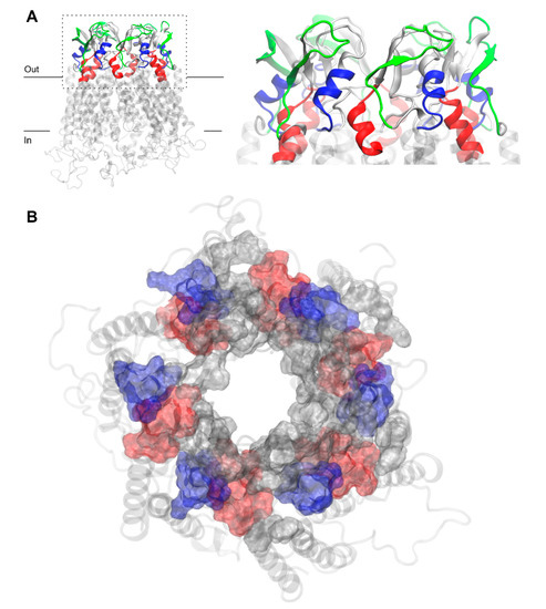 - Maeda, S.; Nakagawa, S.; Suga, M.; Yamashita, E.; Oshima, A.; Fujiyoshi, Y.; Tsukihara, T. Structure of the Connexin 26 Gap Junction Channel at 3.5 A Resolution. Nature 2009, 458, 597–602. [Google Scholar] [CrossRef]