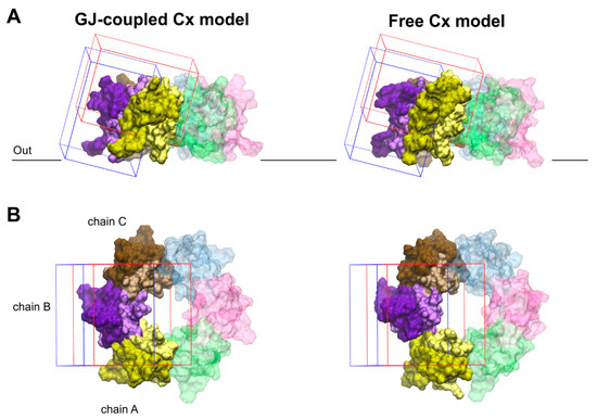 Validation of blind docking search for the binding crevices of Cx inhibitors. Front (A) and top (B) views of boundaries limiting docking grids in the GJ-coupled (left) and the free (right) connexon models. The grid positioned at the water-facing, outer side of EL2 is shown in blue. The other grid, covering the EL1–EL2 interface as well as the top region of the pore-facing EL1 and water-facing EL2 loops, is shown in red. The significant overlap between the two grids allows cross-validation of docking results. Only EL1 and EL2 loops of Cx43 are displayed. EL1 and EL2 loops of each chain are colored by lighter and darker versions of the same color, respectively. Color codes for the different chains are as follows: yellow (A), violet (B), brown (C), blue (D), magenta (E), green (F). Chains not included in the docking grids (D–F) are displayed in transparent colors. For the position of the outer membrane, see legends to Figure 1, Figure 2 and Figure 3 and Section 2.2.