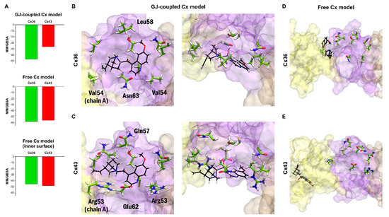 MM/GBSA ΔGbind values obtained for the best 30 blind docking runs (see previous paragraph) for quinine and each peptide mimetic inhibitors have been evaluated. The best MM/GBSA ΔGbind values obtained from docking quinine to Cx36 or Cx43 GJ-coupled models indicate that quinine prefers binding to Cx36 over Cx43 (Figure 5A–C). However, docking quinine into the free Cx36HC and Cx43HC structures did not show subtype-specificity (Figure 5A,D,E). In this structure, quinine was not able to dock onto the same surface identified in docking to the GJ-coupled Cx36 structure, and instead preferred docking to the outer surface of the extracellular region (Figure 5D,E). Filtering the docking results for poses on the inner surface still did not reveal any subtype-specific interaction (Figure 5A, bottom). These data suggest that quinine shall exert its subtype-specificity by entering the GJ from the cytosol. Altogether, the claimed subtype-specificity of neuronal-type Cx36GJ inhibitor quinine [6,27,28,29,30] has been substantiated by molecular modelling of binding at the GJ-coupled, but not in the free Cx36HC versus Cx43HC model structures (Figure 5).