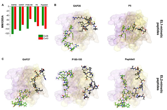 Docking positions of peptide mimetic inhibitors do not correspond to the mimicked sequences. (A) Best MM/GBSA ΔGbind values of peptide mimetic inhibitors after docking to Cx36 or Cx43 free connexon models. (B,C) Best docking conformations of peptide inhibitors (black) and mimicked Cx43 sequence (green) are shown as sticks from front view in the free Cx43HC structure. Only EL1 and EL2 loops of Cx43 A–C chains are displayed. Color codes for the different chains are as follows: yellow (A), violet (B), brown (C). For the definition of the position of the EL1 and EL2 see Section 2.2.