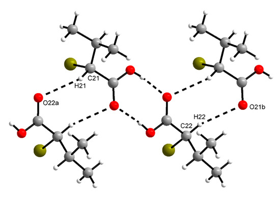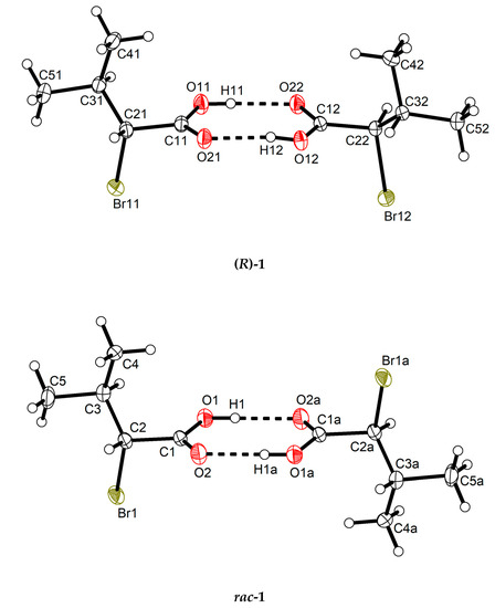 According to theoretical studies, the syn conformation of a carboxy group, as observed in (R)-1 and rac-1, is energetically more stable than the anti conformation by ca. 21.4–28.9 kJ mol−1 [13]. A syn···syn dimer (homosynthon) with a motif is a hydrogen bonding pattern commonly observed for carboxylic acids [40,41]. Its occurrence in the crystal structures of (R)-1 and rac-1 is thus as expected and also in accord with Etter’s rules for hydrogen bonding, whereby all acidic hydrogen atoms and all good hydrogen bond acceptors are involved in hydrogen bonds, and the best donor and the best acceptor are hydrogen-bonded to one another [42]. The short C–H···O contacts observed in (R)-1 (Figure 3) could be interpreted geometrically as weak hydrogen bonds [43]. It reasonable to assume that the hydrogen atom at the α-carbon atom here is prone to weak hydrogen bonds, since the carboxy group as well as the bromine atom should exert an electron-withdrawing effect. Since such contacts are not present in rac-1, their impact on the overall supramolecular structure in the crystal is probably minor.