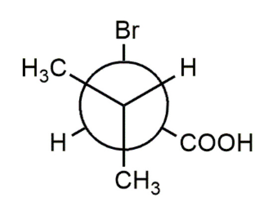 The X-ray intensity data were collected at 100(2) K on an Enraf–Nonius Kappa CCD for (R)-1 and on a Bruker AXS Apex II for rac-1, using Mo Kα radiation in both cases. The data were scaled and corrected for absorption effects with SADABS [21]. The crystal structures were solved with SHELXT [22] and refined with SHELXL-2018/3 [23]. The highest residual difference electron density peak each for (R)-1 and rac-1 is ca. 0.7 Å from a bromine atom and can be ascribed to absorption effects. Carbon-bound hydrogen atoms were placed at geometrically calculated positions with Cmethine–H = 1.00 Å, Cmethyl–H = 0.98 Å and refined using a riding model with Uiso(H) = 1.2 Ueq(C) (1.5 for methyl groups). Torsion angles of the methyl groups were initially determined via difference Fourier syntheses and subsequently refined while maintaining tetrahedral angles at the carbon atoms. The carboxy hydrogen atoms in (R)-1 were located in difference electron density maps. In subsequent refinements, the O–H distances were restrained to a target value of 0.84(2) Å. In rac-1, the carboxy hydrogen atom was placed in an idealized hydrogen bonding position with O–H = 0.84 Å and refined using a riding model. Uiso(H) = 1.2 Ueq(O) was used for all carboxy hydrogen atoms. Refined and post-refinement values of the Flack x parameter [24] were obtained with SHELXL using TWIN/BASF instructions and Parsons’s method [25], respectively. The Hooft parameter [26,27,28] was calculated with PLATON [29]. Crystal data and refinement details for (R)-1 and rac-1 are listed in Table 1. Representations of the crystal and molecular structures were drawn with DIAMOND [30]. The structure overlay diagram and r.m.s. deviations of molecular structures from one another were obtained with MERCURY [31]. Packing indices were calculated with PLATON.