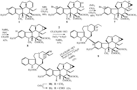 In the first step vindoline (1) was brominated by N-bromosuccinimide in the position 10 (Figure 3) then in the second reaction step, the cyclopropane ring was formed into the position 14,15. Following the bromo atom was hydrogenated from C-10 by sodium borohydride in the presence of a palladium catalyst on charcoal. Then the obtained 14,15-cyclopropanovindoline (8) was coupled with catharanthine (2) resulting in the 14,15-cyclopropanoanhydrovinblastine (9) [,]. The last step was the hydration of the 15′-20′ carbon–carbon double bond obtaining the 14,15-cyclopropanovinblastine (10). The 14,15-cyclopropanovincristine (11) was prepared by the CrO3 oxidation of cyclopropane derivative (10) of vinblastine (3) [,].