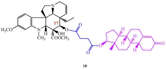 The conjugation of Vinca alkaloids with (l)- and (d)-tryptophan methyl ester proved that the cytotoxic effect of vindoline (1) can be promoted by coupling this monomer with suitable pharmacophores. As a continuation of our work we aimed to synthesize vindoline (1) steroid hybrids presuming that the lipophilic steroid vector can facilitate Vinca alkaloids to pass through the cell membranes and reach higher bioavailability. Accordingly, 5α-dihydrotestosterone and 19-nortestosterone were connected to vindoline (1) in positions 10 and 17 through succinate linkers. From the successfully synthesized four new hybrid derivatives, the most efficient one was compound 18, where 19-nortestosterone was coupled with vindoline (1) in position 17 (Figure 6) []. According to the in vitro biologic evaluations of NIH (USA), compound 18 displayed increased cell growth inhibition than vindoline (1), furthermore, it showed a higher antitumor effect on several cell lines even than vinblastine (3) sulfate used in therapy.