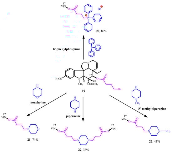 After the encouraging results derived from the conjugation of natural pharmacophores (amino acid esters and steroids) and Vinca alkaloids, our next research project was to combine vindoline (1) with well-known synthetic pharmacophores for example triphenylphosphine and certain N-heterocycles such as morpholine, piperazine and N-methylpiperazine. These moieties are widely used pharmacophores in modern drug discovery and proved to be efficient structural units of several drugs on market [,]. Our main purpose was still the same: producing new vindoline hybrid molecules which could have potential anticancer activity. First, vindoline (1) was O-acylated with 4-bromobutyric acid, after hydrolysis in position 17. After this step, the linker-containing vindoline derivative (19) was successfully coupled with the mentioned synthetic pharmacophores to give the expected hybrid molecules (20–23) (Figure 7) [,,].