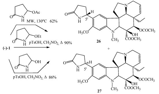 Our other important research area was the chemistry of Aspidospermane alkaloids. A detailed review was published in 2008 by us presenting the synthesis and derivatives of these types of alkaloids []. Then the first synthesis of bannucine (26) and 5′-epibannucine (27) was elaborated []. This alkaloid was first isolated in 1986 from the leaves of Catharanthus roseus by Atta-Ur-Rahman and coworkers []. Bannucine (26) is a derivative of vindoline (1) having a 2-pyrrolidone ring in position 10. The key step of the procedure appears the reaction between the natural (−)-vindoline (1) and a cyclic N-acyliminium intermediate. As a result of the reaction not only the bannucine (26), but also its 5′-epimeric isomer (27) was formed in an approximate ratio of 2:3 (Figure 9). The isomers were separated, and their structure was identified also by X-ray crystallography. The pure epimers were investigated on 57 cell lines of different types of cancer, however, important anticancer activity was not found [].