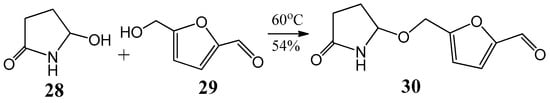 The first synthesis of sessiline (30) was achieved by applying the experiences gained in the field of acylaminocarbinols []. The alkaloid sessiline (30) was isolated from the fruits of Acanthopanas sessiliflorus in 2002 []. The molecule consists of two 5-membered heterocycles coupling through an acylaminocarbinol ether-type bond (Figure 10). Sessiline (30) was prepared by reaction of 5-hydroxypyrrolidin-2-one (28) with 5-hydroxymethyl-furfural (29) at 60 °C with 54% yield [].