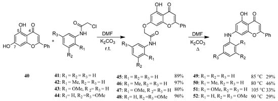 Chrysin (40)—also known as 5,7-dihydroxyflavone—can be found among others in Passiflora caerulea [,], honey and propolis. Like several flavonoids, it has a number of biologic effects, of which it is important to mention its anticancer activity both as a chemopreventive and as a chemotherapeutic agent []. The driving force of our work was that several 7-O-modified derivatives had been found to be effective against different malignant tumor cells [,]. Therefore, we synthesized several new aryloxy acetamide derivatives (45–48) (Figure 13). These products were rearranged to a biphenyl amine structure via Smiles rearrangement and hydrolysis to obtain a new series of 7-aminoflavone derivatives (49–52) (Figure 14) [].