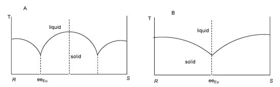 In our work [4,5] we proved that the result of non-linear processes of enantiomers, enantiomeric mixtures, and mixtures of diastereomers, taking into account the solvent and the crystallization time, depends on the eutectic ratio of the enantiomeric mixtures of the participating chiral compounds. By this eutectic composition, the enantiomeric ratio (eeEu) corresponding to the eutectic points of the “binary melting point phase diagrams” of the enantiomeric mixtures (Figure 1) is meant.