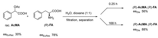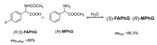 For example, after dissolving racemic fluor-acetyl-phenylglicine (FAPhG) and (R)-methyl- phenylglicine ((R)-MPhG) in water, the (S,R)-diastereomer could be separated by crystallization (Figure 5), where the eeDia was circa 86.3%, which is in good agreement with the eutectic composition of the racemic compound (eeEuRac ~88%).