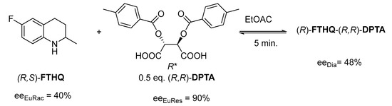 For example, the eutectic composition of the Flumequine intermediate (FTHQ) for the racemic base corresponds well with the composition of the enantiomeric mixture isolated from the diastereomer obtained with the (R,R)-DPTA resolving agent (Figure 6) [13].