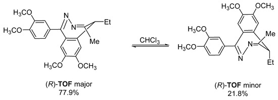 One of the enantiomers ((R)-TOF) of a benzodiazepine derivative (Tofizopam TOF) in chloroform at room temperature including 100% of the major conformer converts into a mixture of 77.9% major and 21.8% minor conformer in 48 h. However, racemic Tofisopam immediately forms two conformers upon dissolution (Figure 8) [17].