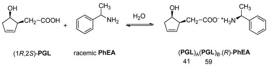 The single enantiomeric resolving agent is also involved in the crystalline structure of the diastereomeric salt—formed with the enantiomer of the racemic compound—with its two conformers (in a ratio of 41/59), e.g., when reacting (1-hydroxy-2-cyclopentenyl)acetic acid (PGL) with racemic phenylethylamine (PhEA) (Figure 9) [18].