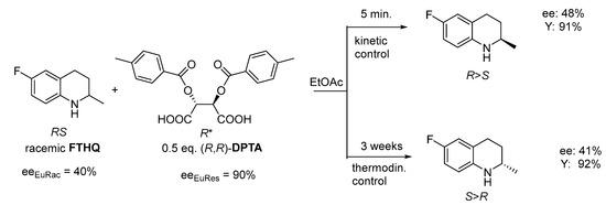 - Bálint, J.; Egri, G.; Kiss, V.; Gajary, A.; Juvancz, Z.; Fogassy, E. Unusual phenomena during the resolution of 6-fluoro-2-methyl-1,2,3,4-tetrahydroquinoline (FTHQ): Thermodynamic-kinetic control. Tetrah. Asymmetry 2002, 12, 3435–3439. [Google Scholar] [CrossRef]