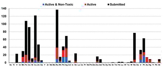 Depending on the type of metal ion coordination complexes and organometallics, they offer a wide range of oxidation states, coordination numbers and geometries, leading to a virtually unlimited number of structures and conformations. With the improvement of knowledge and understanding of biological processes, judicious metal–ligand combinations can be designed with appropriate geometry for specific interactions. For example, some of them have already been used to inhibit enzymes, label proteins, image cells, probe biomacromolecules, alter bioavailability or provide contrast as MRI agents [13]. In addition, the broad range of metal–ligand combinations makes it possible to design new entities with various physical properties and chemical reactivities including charge, solubility, rates of ligand exchange, strengths of metal–ligand bonds, Lewis acidity, metal- and ligand-based redox potentials, outer-sphere interactions, and ligand conformations [14]. Therefore, compared to organic drugs, the structural and electronic properties of such complexes offer biological and chemical diversity, making them very attractive in the field of medicinal chemistry, especially as antimicrobial agents with novel modes of action to treat drug-resistant diseases. From this point of view, the transition metals accompanied by some other metals are the most promising for disease treatments, while the heavy lanthanides are more investigated for their radioactive and photoluminescent properties. This is illustrated by the growing amount of this kind of organometallic species deposited on open databases specialized in bioactive compounds. Hence, a study of Blaskovich and co-workers, who investigated the compounds submitted on the Community for Open Antimicrobial Drug Discovery, classified the organometallic compounds according to the nature of their metal element and their activity and toxicity [15]. These graphs (Figure 1) therefore reflect the most interesting ions for future work.