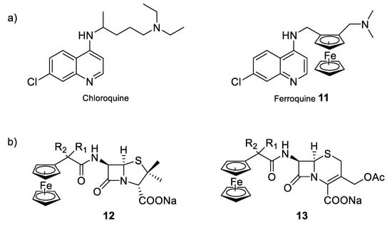 Bio-organometallic compounds of conventional antibacterial drugs. (a) Schematic structures of chloroquine and ferroquine, two of the most commonly used antimalarial compounds [86]; (b) semi-synthetic derivatives of penicillin and cephalosporin [87].