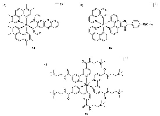 Although ruthenium complexes have been widely studied for their anticancer activity, some interesting antimicrobial properties were also described since the mid-twentieth century by Dwyer [90,91]. Among all the tested transition metals, it was shown that the inert polypyridylruthenium(II) complex [Ru(Me4phen)3]2+ exhibited remarkable antimicrobial activity in vitro, particularly against Gram-positive strains [92]. The activity of these octahedral complexes is probably due to their ability to interact with nucleic acids through intercalation with aromatic bases, aided by electrostatic attraction between the positive charged-metal complex and the negative charged phosphate groups. Aldrich-Wright and co-workers also reported that their mononuclear Ru(II) complexes [Ru(2,9-Me2phen)2(dppz)]2+ (compound 14, Figure 11) incorporating DNA intercalating ligands exhibited significant antibacterial activity against Gram-positive bacteria (B. subtilis and S. aureus, MIC = 2–8 μg/mL) [93]. However, these complexes were not active against the Gram-negative bacterium E. coli. The mechanism of action remained unclear but the hypothesis mentioned is that the Ru(II) complexes were not able to cross the outer membrane of E. coli.