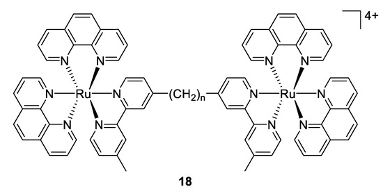 Another approach reported firstly by Keene and Collins in 2011 was to investigate the antimicrobial activity of an extensive range of mono-, di- and oligonuclear inert polypyridylruthenium(II) complexes [98]. The results demonstrated that for the dinuclear Ru(II) complexes linked by long flexible alkane chains (compounds 18, Figure 13) are highly active against both Gram-positive and Gram-negative bacteria (with MIC values that are comparable or better than the well-known antibiotic gentamicin), but are considerably less toxic to human eukaryotic cells. In subsequent studies, the same group exhibited that the antimicrobial activity of these complexes is correlated with the level of cellular uptake. As the longer alkyl chain length leads to more lipophilic compounds, the authors concluded that the increasing lipophilicity is responsible for the higher uptake [99]. Later, they showed that compound 18 with n = 16 condensed ribosomes when they existed as polysomes, leading to stop the protein production, and thereby inhibit the bacterial growth [100].
