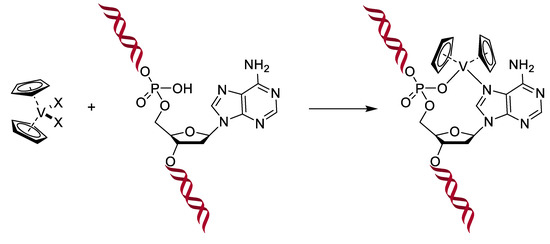 Vanadium is present as cofactors in certain enzymes, such as haloperoxidases and in some kinds of nitrogenases expressed by nitrogen metabolizing bacteria. It is even found at high concentrations (0.15 M) in the blood of some marine animals like sea squirts [136]. Moreover, the structure of the vanadate VO43− is very close to that of phosphate PO43−. In addition, there are other similarities, such as in esterification-type reactions; vanadate can therefore be considered a competitor of phosphate. Knowing the great importance of phosphate in several very different biochemical pathways (kinases, ATP, etc.), vanadate is becoming an interesting target to study, and that is even more true when looking at their pKa (7.2 for phosphate means a similar ratio for H2PO4− and HPO42−, while it is 8.2 for vanadate, meaning that H2VO4− is the main species at the physiological pH) and at the coordination (phosphorous can typically not be coordinated by more than five ligands, while vanadium can accept six). Altogether, it was demonstrated that if vanadate easily replaces the phosphate in an enzyme, it can form stable complexes with the enzyme’s target, inhibiting the enzyme [135]. As a small aside about our antimicrobial topic, two consequences of this similarity with phosphate are in the treatment of diabetes and cancers: Vanadium is able to interfere in the metabolism of glucose, making it possible to reduce the acute as well as the secondary consequences of diabetes by mimicking insulin. Indeed, diabetes appears when the insulin-receptors of cells no longer recognize insulin. Yet, the linking of insulin to its receptors normally results in the phosphorylation of a tyrosine residue, which starts a chain reaction. In the absence of insulin, or in case of non-response, the tyrosine is dephosphorylated by another enzyme. Thus, when diabetics are treated with vanadate, it can bind to the active site of this last enzyme and inhibit the dephosphorylation, leading to an activation of the insulin signaling pathway even when the insulin receptor does not react to insulin [137]. Moreover, intervening in the phosphorylation reactions, vanadate therefore causes some issues for cells that have a high need for phosphate. This is the case for tumor cells, which present an uncontrolled development. Hence, uptake of vanadium complexes has been shown to induce cellular death in different kinds of tumors. Another proposed mechanism of action is the generation of ROS in tumoral cells, and it was also shown that vanadocene-derived compounds (by analogy with ferrocene) are able to interact with the DNA, forming a stable complex leading to apoptosis (see Figure 17). Other metallocenes show similar activity, particularly titanocene, molybdenocene, and niobocene [136,137].