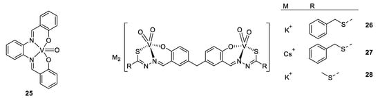 To come back to our antimicrobial focus, there is ongoing research surrounding the use of vanadium complexes against some parasites. One of the first studies reporting results in this domain was published in the early 2000s, where Barti et al. tested some protozoicidal organic molecules as ligands for different transition metals, like molybdenum, vanadium, and tungsten. All the complexes showed a lower IC50 against an amoeba (Entamoeba histolytica) than their respective ligands alone, and the best results were found for a vanadium complex of 2-(salicylideneimine)benzimidazole (Figure 18, compound 23), exhibiting an IC50 value of 2.35 µM (compared to 9.20 µM for the title ligand and 2.99 µM for the molybdenum complex; tungsten complex n.d.) [140].