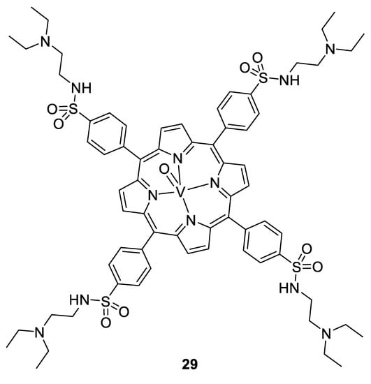 The research continued (and is continuing) around some other parasites, mainly against tropical parasites, and particularly against Trypanosoma cruzi. This protozoan parasite causes Chagas disease, resulting in 10,000 deaths per year and 8 million infected people. Several publications dealing with vanadium complexes for potential antitrypanosomal treatment are available, and some of this work was done by the group of Dinorah Gambino. They proposed several vanadium complexes based on salicylaldehyde- and polypyridyl-derivatives ligands [141,142,143]. Another example is a vanadium complex of aminophen and bromosalycilaldehyde (Figure 18, compound 24), whose IC50 was shown to be in the low micromolar range (0.27–3.8 µM) [144,145] against T. cruzi, similar to the standard drug nifurtimox, but a live/dead assay only resulted in a trypanostatic effect, with the parasites recovering to normal growth after the cutting off treatment. Moreover, the compound did not present toxicity against murine macrophages serving as a mammalian model. Indeed, its IC50 is around 50 µM, almost 200 times higher than against T. cruzi, reflecting a high selectivity. Investigation around the mechanism of action showed that whereas only 2.4% of the dissolved complex was taken up by the parasites (which is a similar amount to what was observed for other metallodrugs such as cisplatin), a high concentration on vanadium was observed within the DNA and the RNA (0.089 ng of vanadium/µg of DNA, and 0.006 ng of vanadium/µg of RNA), suggesting a strong interaction with DNA. A deficiency of the mitochondria is hypothesized as well, due to the high level in the cytoplasm of some organites used in the mitochondria. Moreover, the analysis of the protein expression concluded to overexpression of transporters and drug efflux, and of some proteins involved in the transcription. This is coherent with the presence of vanadium in DNA, the deficiency of the mitochondria, and overexpression of some proteins involved in reduction/oxidation pathways and hydrolysis, suggesting the vanadium complex to cause some redox disorders [144,145].