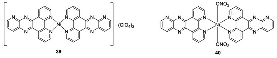 The same was observed by Sun et al., who tested a [Ru(phen2)(p-BPIP)]2+ against E. coli, M. tetragenus, S. aureus, and some moistures. Antibacterial activity was found only against both Gram-positive bacteria. Further scanning electron microscopy studies showed non-smooth cell walls, and parts of the cytoplasm outside of the bacteria cell. Finally, it was demonstrated that the complex causes the fragmentation of the DNA. Therefore, it was concluded that the treatment of Gram-positive bacteria by the ruthenium complex resulted in a perforated membrane due to its interaction with the bacterial cell wall, increasing the permeability, even if the main mechanism of action of [Ru(phen2)(p-BPIP)]2+ (Figure 11, compound 15) is the damage of the DNA and RNA [94].