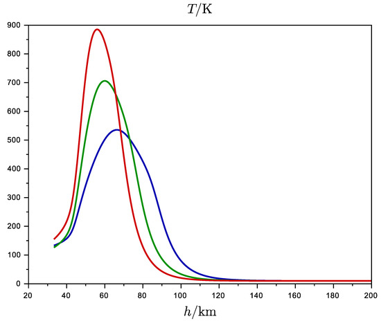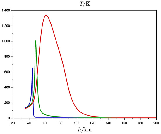 Temperature profile during atmospheric entry versus altitude for micrometeoroids of initial velocity (blue), (green), and (red) (, ).