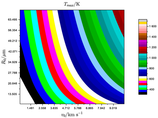 Contour lines of the maximum temperature during atmospheric entry versus the initial velocity and radius of micrometeoroids with and ().