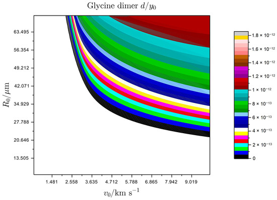 Contour lines of the relative concentration of diglycine ( ) calculated with , , and versus the initial velocity and radius of micrometeoroids with and .