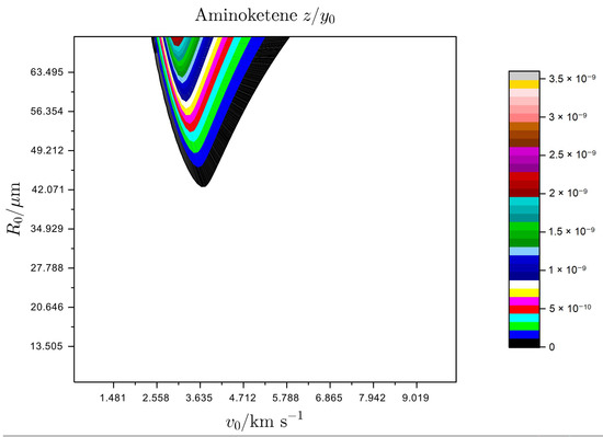 Contour lines of the relative concentration of aminoketene ( ) calculated with , , and versus the initial velocity and radius of micrometeoroids with and .