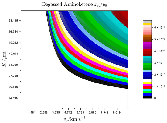 Contour lines of the relative fraction of degassed aminoketene ( ) calculated with , , and versus the initial velocity and radius of micrometeoroids with and .
