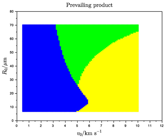 Plot of the prevailing product inside the micrometeorite at the end of its trajectory (blue: retained amino acid, green: aminoketene, yellow: glycine dimer) calculated with , , and versus the initial velocity and radius of micrometeoroids with and .