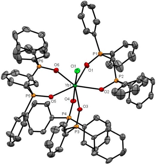The X-ray structures of [Er(dppmO2)3Cl]Cl2 (Er-O = 2.28 Å av.) [17], [Yb(dppmO2)3Cl]Cl2 (Figure 4; Yb-O = 2.28 Å av.) and [Dy(dppmO2)3Cl]Cl2 (Figure S43) show pentagonal bipyramidal cations with an apical chloride. The Ln-O distances are rather variable (Er-O = 2.244(6)–2.328(6) Å; Yb-O = 2.250(2)–2.269(3) Å), but are shorter than those in the tetrakis-dppmO2 cations, reflecting both the reduced coordination number and the smaller metal ion radii (Er = 1.062, Yb = 1.042 Å). The contraction in ionic radii is also evident in the Ln-Cl distances of 2.598(2) Å (Er) and 2.5829(9) Å (Yb). Crystals of [Dy(dppmO2)3Cl]Cl2 were also obtained and show the same cation type, but during refinement, several of the phenyl rings exhibited severe disorder and the data are therefore not included here (Figure S43).
