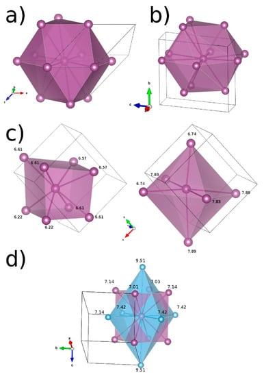 The high symmetry of the two anions is also responsible for the building principle of corresponding crystal structures based on the packing of hard spheres. Inorganic hydroborates usually contain three types of anion packing: two close packings, cubic close packing (ccp) and hexagonal close packing (hcp), and one less dense packing in a body-centered cubic cell (bcc). However, the poly-anion nature of hydroborates complicates the detections of the packing type, which usually deviates from the ideal packing. For instance, the hexagonal layers of ccp or hcp are not always parallel to simple crystallographic planes. In some works, the anion packing was analyzed with the algorithms developed for molecular dynamics (MD) simulation [17], which gives the frequency with which each basic packing maps locally the analyzed structure. This is justified when studying with MD the temporal evolution of some microscopic aspect (such as the distribution of energy barriers for diffusion), and necessarily the atomic positions are given as the atoms’ distribution, hence anions packing distribution. However, it makes no sense to use such an algorithm for the analysis of a periodic structure, which gives the averaged description of the structure and where the atoms in the unit cell are located on Wyckoff sites even when the structure is disordered. Instead, the easiest method is to analyze the shape of the first and second coordination sphere of anion–anion interaction, i.e., considering the poly-anions centers: in both close packings, the coordination number of the first sphere is 12, and the polyhedron shape is cuboctahedron for ccp (Figure 2a) and anti-cuboctahedron for hcp (Figure 2b). In bcc packing, the first coordination sphere has a cubic shape, since there are eight nearest neighbors, while the second coordination sphere contains six anions forming an octahedron. Together, the first and second coordination spheres form a rhombic dodecahedron in bcc (Figure 2c). We will allocate a type of packing to a given hydroborate, based on the anion–anion coordination polyhedron (which may be deformed) and on the number, type, and connectivity of the interstitial sites, which must not change with respect to the ideal packing.