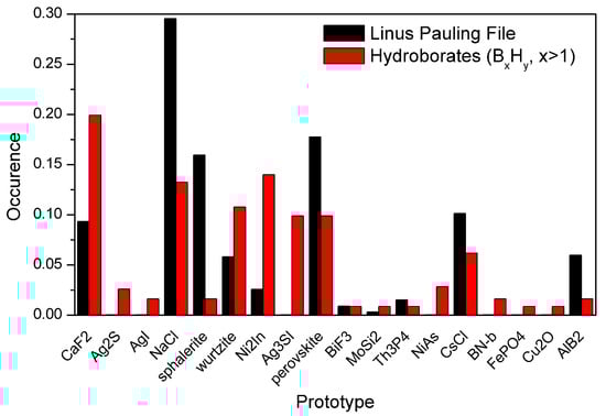 The hydroborates discussed in this review are listed in the following tables: Table 1 contains single cation hydroborates, Table 2 contains double cation hydroborates, and Table 3 contains the hydroborates with inorganic poly-cation. The structural prototypes given in the tables can be found in different crystallographic databases of inorganic compounds such as the Inorganic Crystal Structure Database [49] or Pearson’s Crystal Data [50], and in the following, we will not be providing the references for each structural prototype. The occurrence of structural prototypes among the hydroborates is shown in Figure 4, and it is compared with the occurrence among all inorganic compounds as extracted from the Linus Pauling File (LPF) [51].